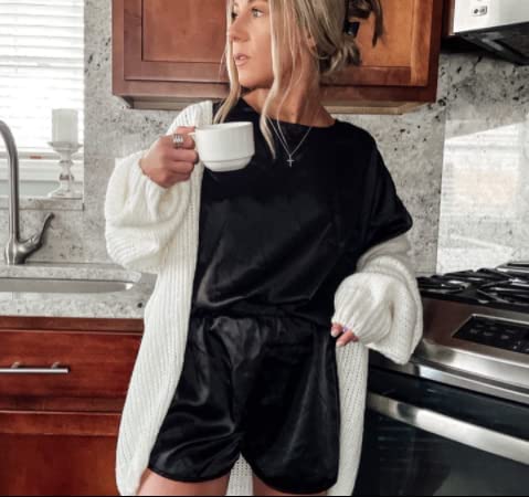 Minimalist Black Satin Women's Pyjama, Loungewear Short Sleeve and Shorts, 2 Piece Set