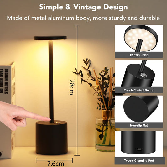 Minimalist Black Cordless Table Lamp with 3 Brightness Levels for Bedroom, Bathroom, Living Room, Office, Patio
