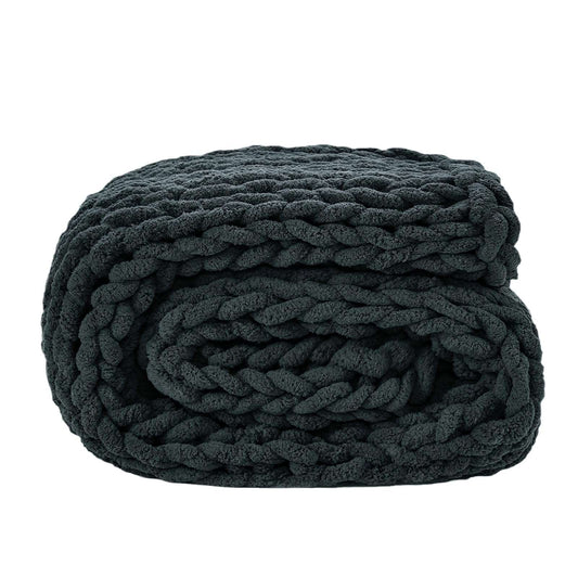 Minimalist Black Chunky Knit Jumbo Chenille Throw 51"x63", 100% Hand Knitted