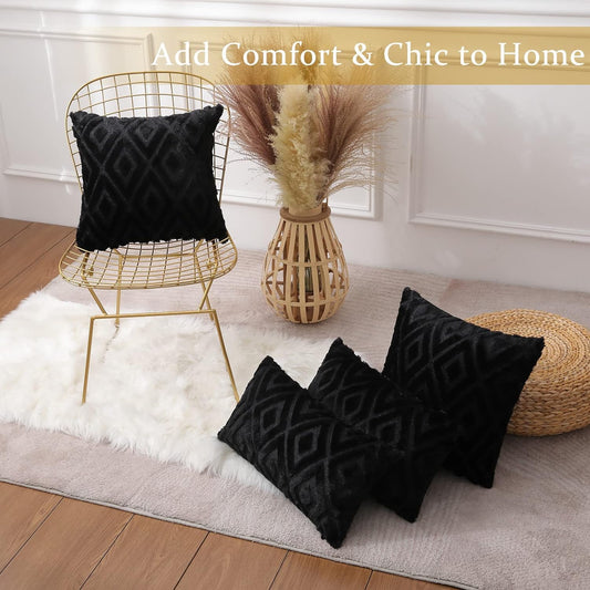 Minimalist Black Plush Faux Fur + Velvet Throw Pillow Covers 18" x 18", 2pcs