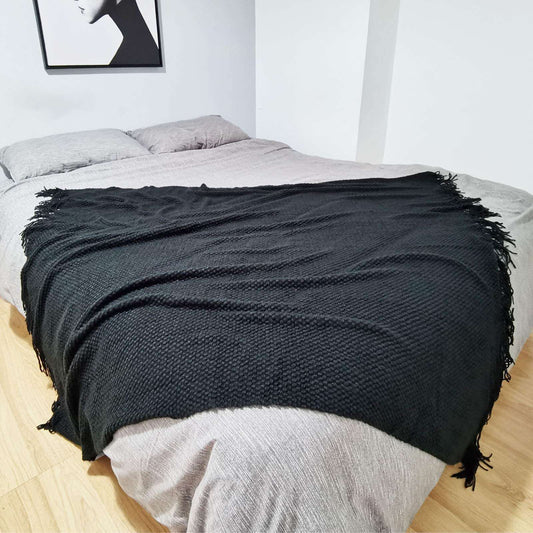 Minimalist Black Knitted Throw Blanket w/Tassels, 50"x60"
