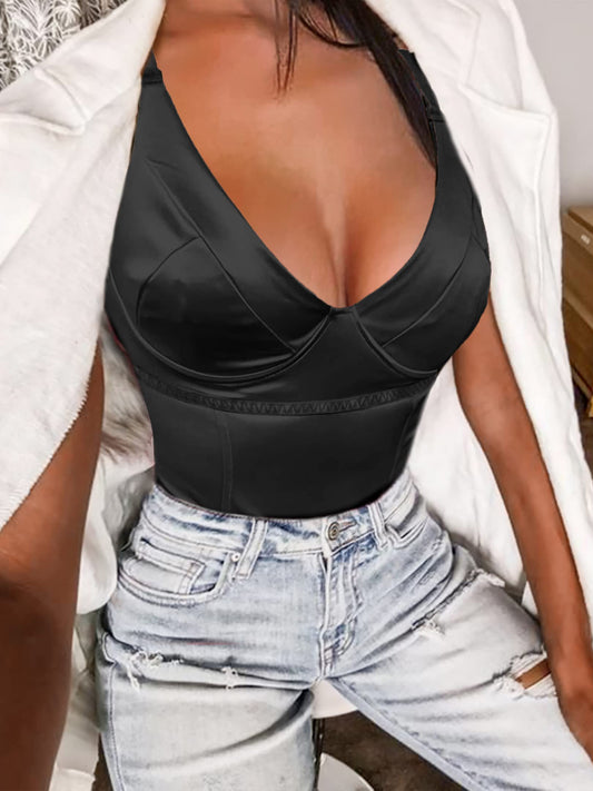 Minimalist Black V Neck Satin Bodysuit