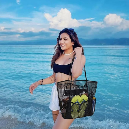 Minimalist Black Mesh Foldable Beach Tote Bag w/Zipper Pocket